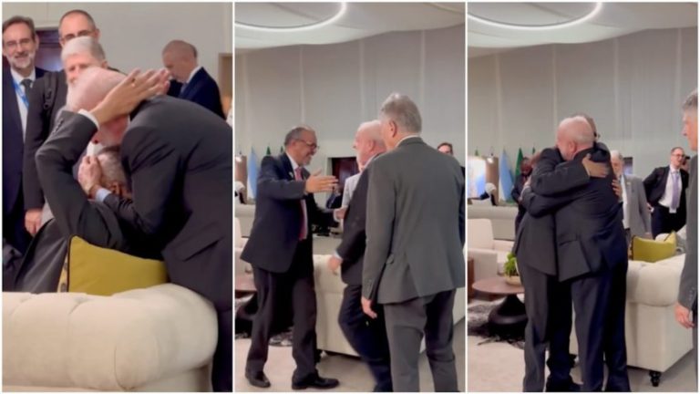 Nas imagens, Adhanom está sentado, Lula chega por trás e tapa os seus olhos. O diretor-geral da OMS precisa adivinhar quem é. Depois, eles se abraçam e conversam. “Um momento descontraído com o presidente Lula na Cúpula do G20 da semana passada, em Joanesburgo”, escreveu o diretor-geral da OMS.