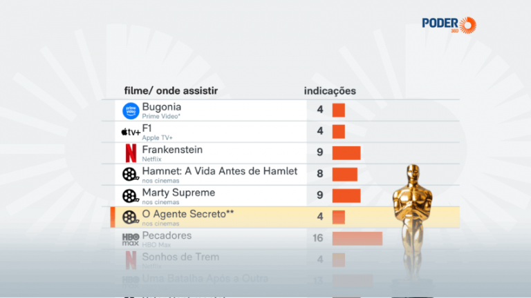 Das 10 produções indicadas à categoria de melhor filme, 6 estão disponíveis em plataformas de streaming e 4 ainda estão em cartaz nos cinemas, incluindo “O Agente Secreto”.